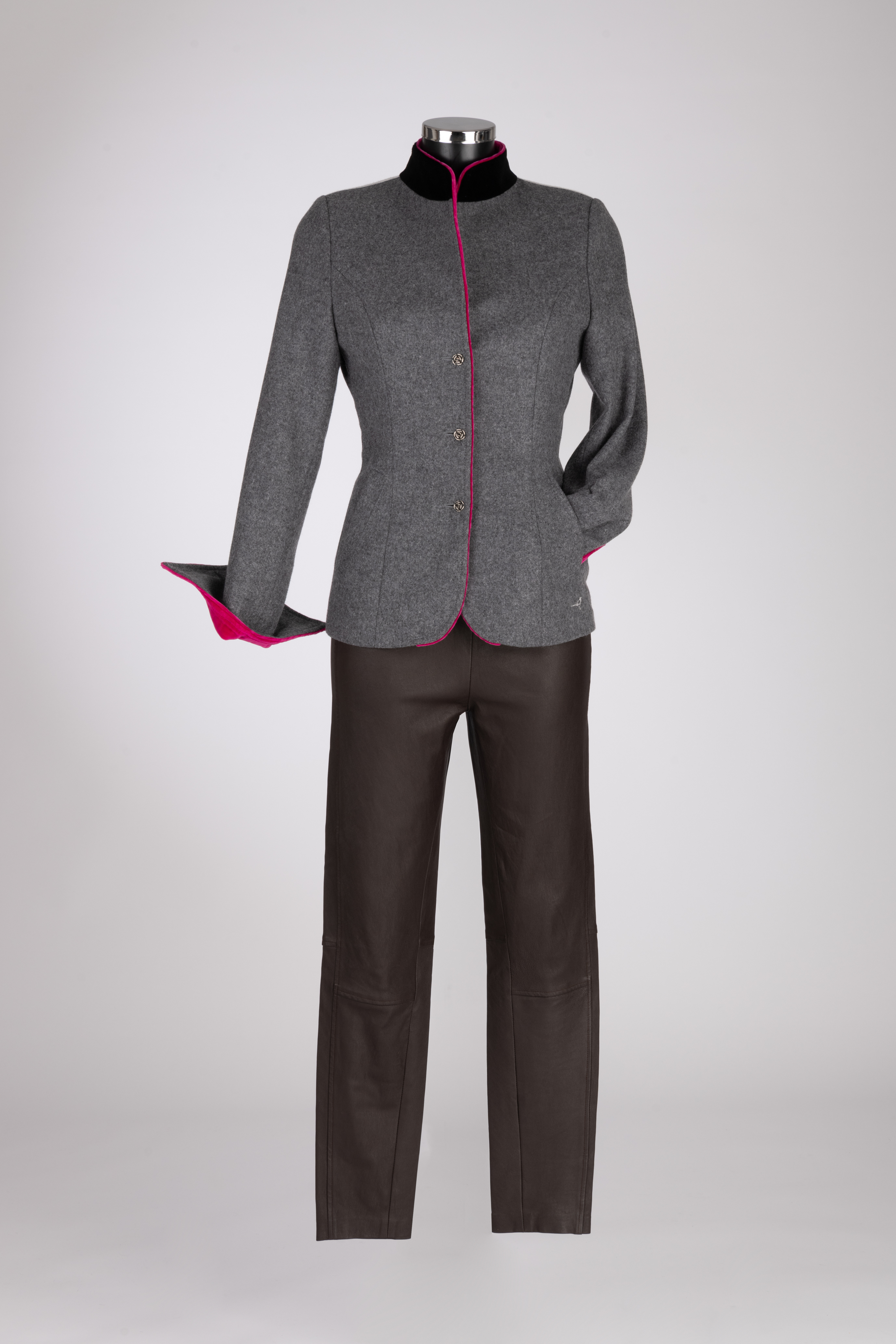 Der moderne Lodenjanker verbindet traditionelle Materialien mit einem ausgefallenen, jungen Design. Der Kragen aus Kalbsfell setzt einen edlen Akzent, während die Kanten mit feiner Samtpaspel dem Janker eine hochwertige, elegante Kontur verleihen.