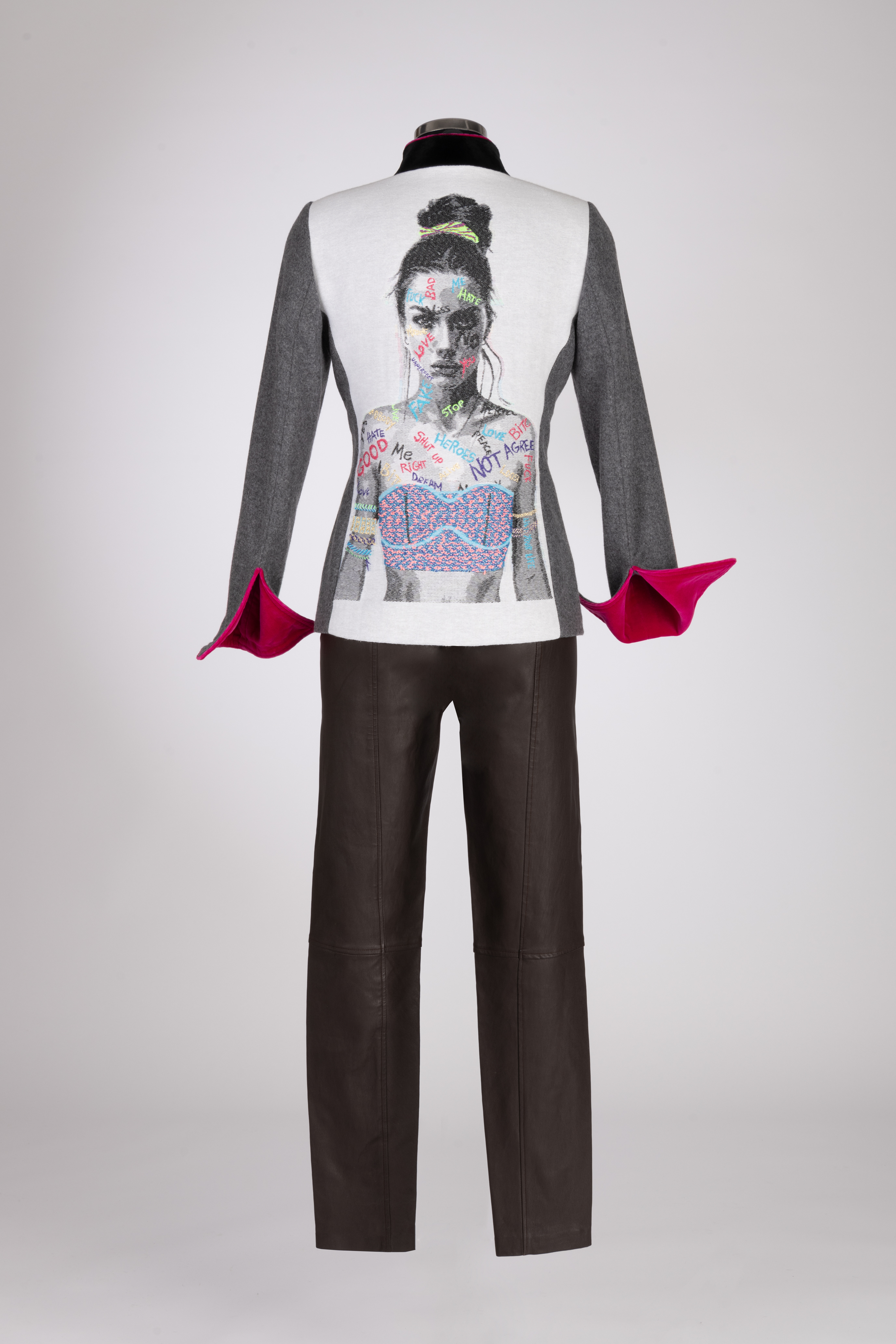 Das Highlight befindet sich auf dem Rückenteil: ein künstlerisch gestalteter Frauenkopf, der dem Modell eine individuelle, kreative und moderne Note verleiht. Damit wird dieser Janker zu einem echten Statement-Piece für alle, die gerne besondere Mode tragen.