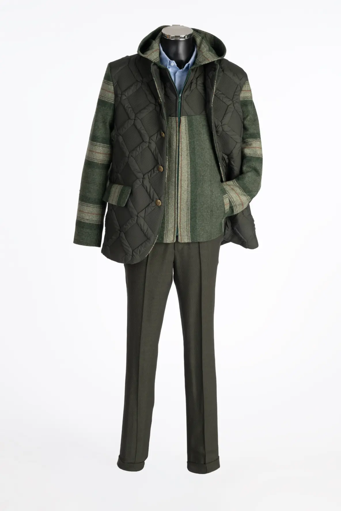 Dazu passend gibt es eine Weste aus Wolle, die mit Kapuze und Reißverschluss ausgestattet ist. Die Weste kann unter dem Stepper getragen werden, sodass man bei jedem Wetter optimal warm bleibt. Die Kombination aus Stepper und Weste ist funktional und gleichzeitig modisch abgestimmt.